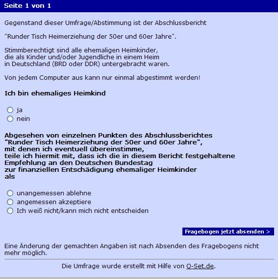 Knapp 92 % der ehemaligen Heimkinder akzeptieren das Ergebnis des Runden Tisches (Schlußbericht) nicht.