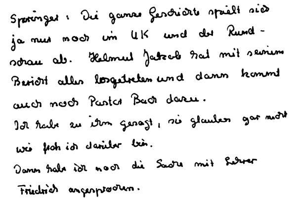 anfänglichen Beschwichtigungsversuchen nun doch an einer echten Aufbereitung interessiert ist. Mit Herren Springer habe ich den Kontakt völlig abgebrochen, weil er absolut zu nichts führt. Er hat ja auch an anderer
